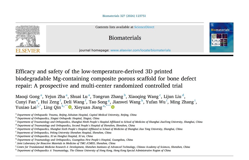 博骼列®的临床有效性与安全性已通过严格的多中心随机对照临床试验验证,并发表于国际顶级期刊 《Biomaterials》。该文章基于以国家骨科中心北京积水潭医院为牵头单位的8家三甲医院、174例患者的前瞻性多中心随机对照临床试验数据,系统性地验证了博骼列®在肢体骨缺损修复中的安全性和有效性。